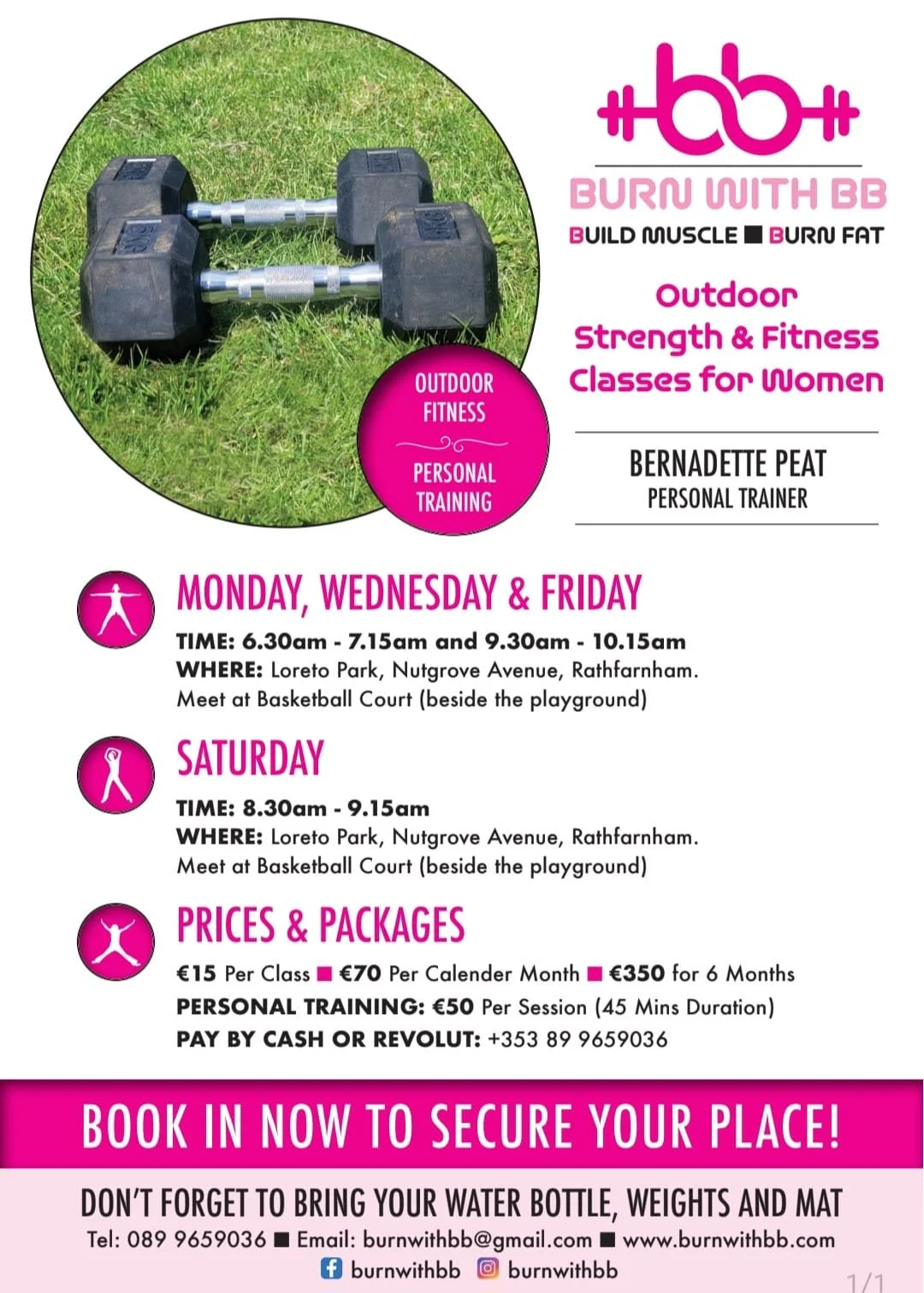 OUTDOOR STRENGTH TRAINING CLASSES FOR WOMEN IN SOUTH DUBLINwith BERNADETTE PEAT, PERSONAL TRAINER €15 Per Class | €70 Per Calendar Month | €350 for 6 MonthsPAY BY CASH OR REVOLUT: +353 89 9659036